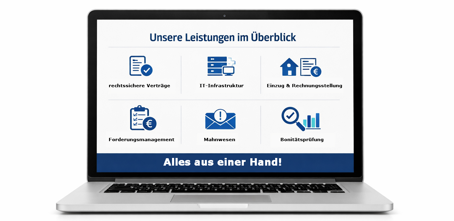Wir übernehmen Ihre gesamte Vertragsverwaltung, Bonitätsprüfung und das Mahnwesen. Genießen Sie volle Liquidität durch unsere Ausfallgarantie – während wir im Hintergrund den Papierkram erledigen.