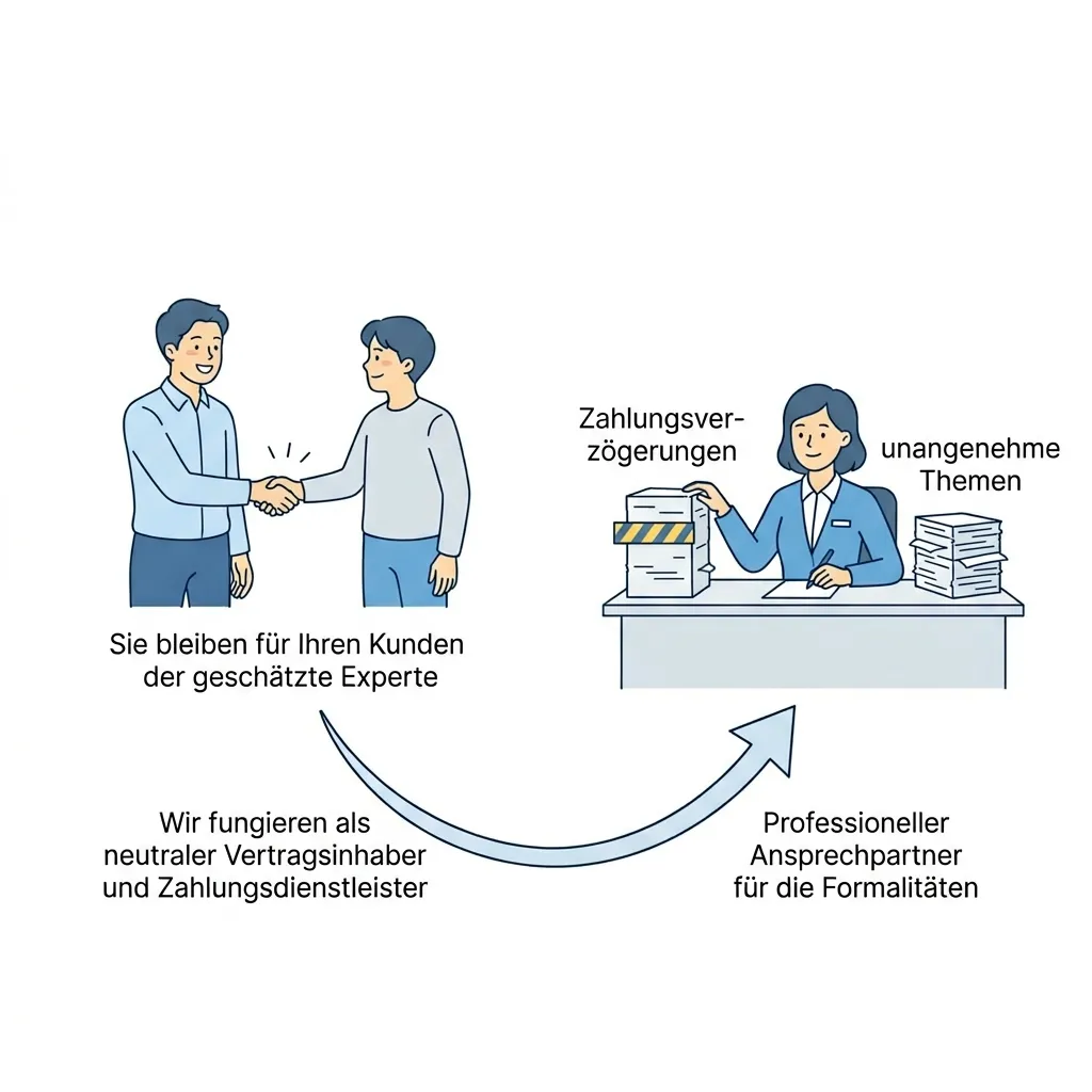 Im Gegenteil. Wir wirken als professioneller, neutraler Dritter. Wenn es um Zahlungsmodalitäten geht, sind wir der Ansprechpartner. Das erlaubt es Ihnen, sich voll auf die beratende oder handwerkliche Ebene zu konzentrieren und der „Gute“ in der Beziehung zu bleiben. Differenzen über Geld belasten so niemals Ihre persönliche Zusammenarbeit mit dem Kunden.